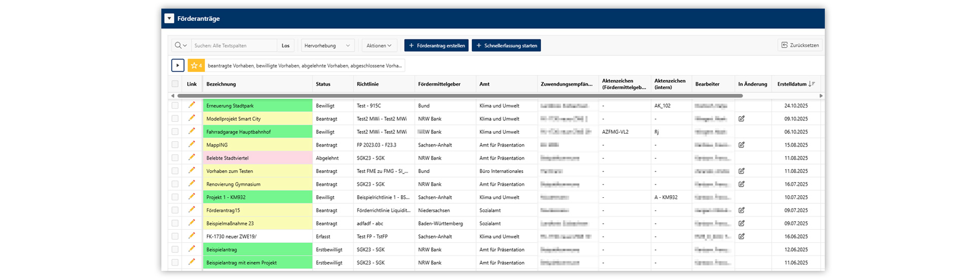 - Sortieren, Gruppieren, Aggregieren, Markieren, Filtern in allen Tabellen möglich, individuell für alle Förderseiten